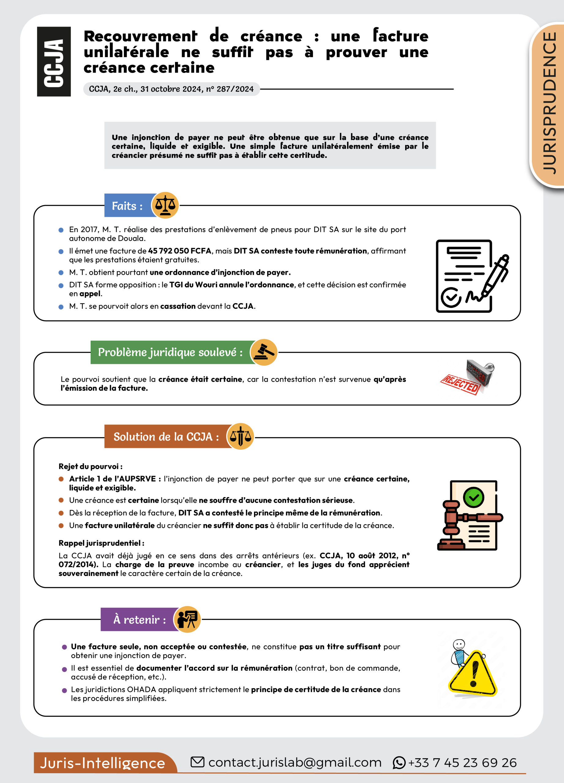 Les juridictions OHADA appliquent strictement le principe de certitude de la créance dans les procédures simplifiées.