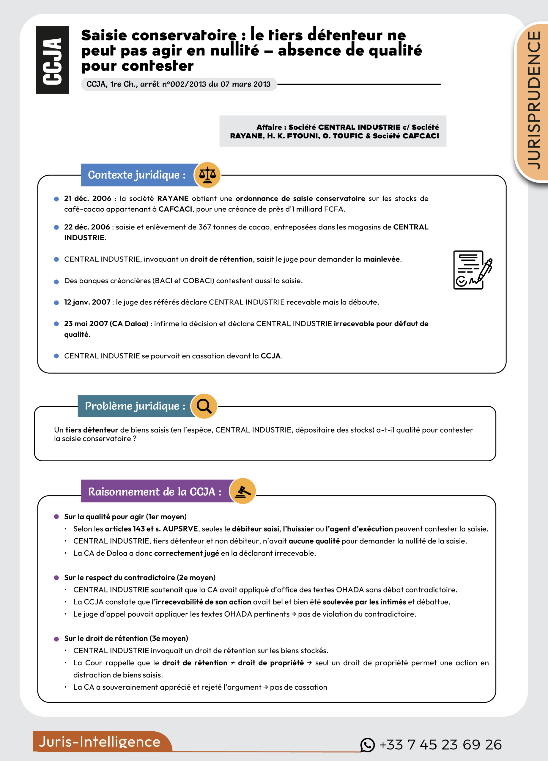 - 23 mai 2007 (CA Daloa) : infirme la décision et déclare CENTRAL INDUSTRIE irrecevable pour défaut de qualité.