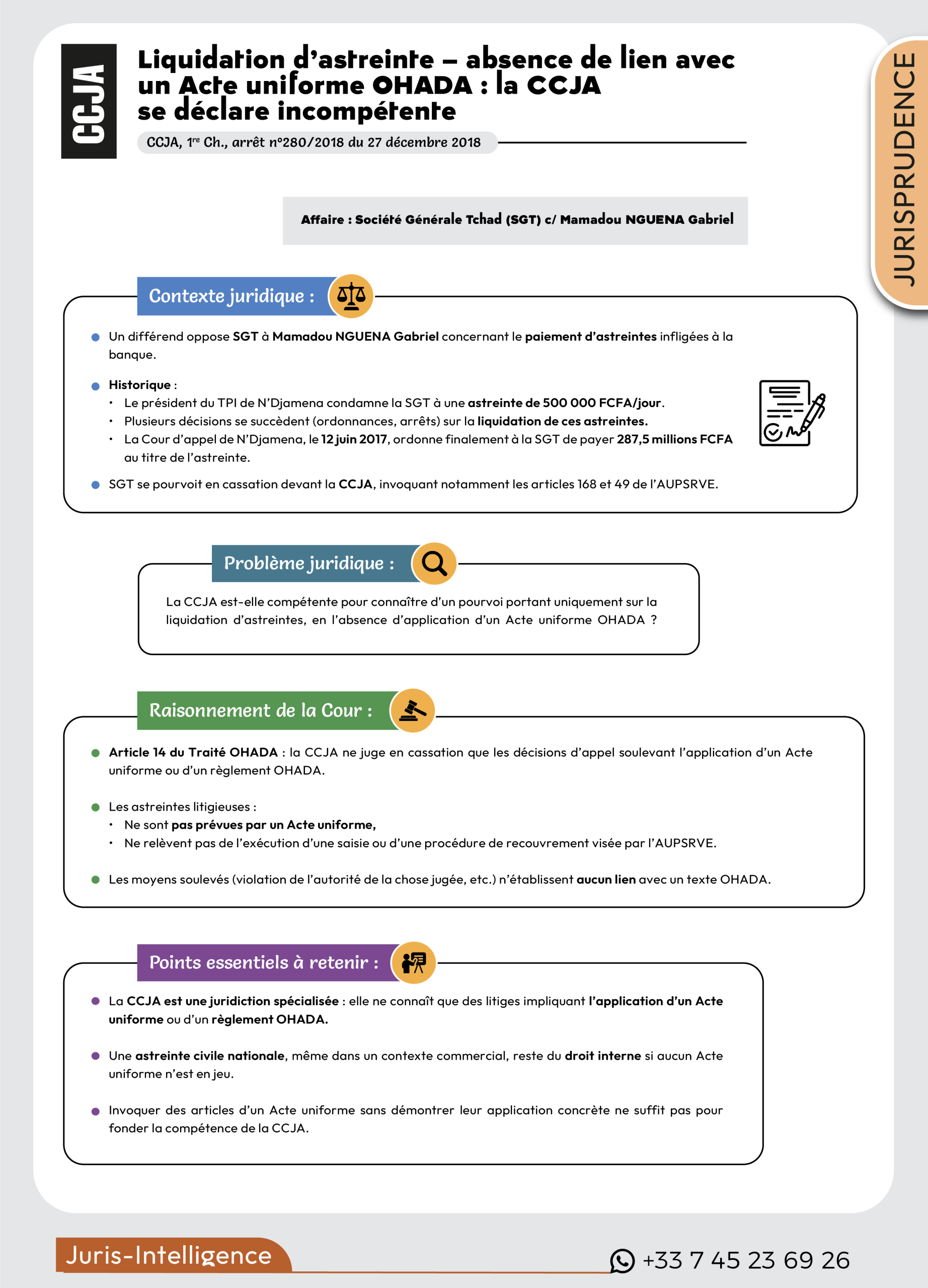 Liquidation d’astreinte – absence de lien avec un Acte uniforme OHADA : la CCJA se déclare incompétente