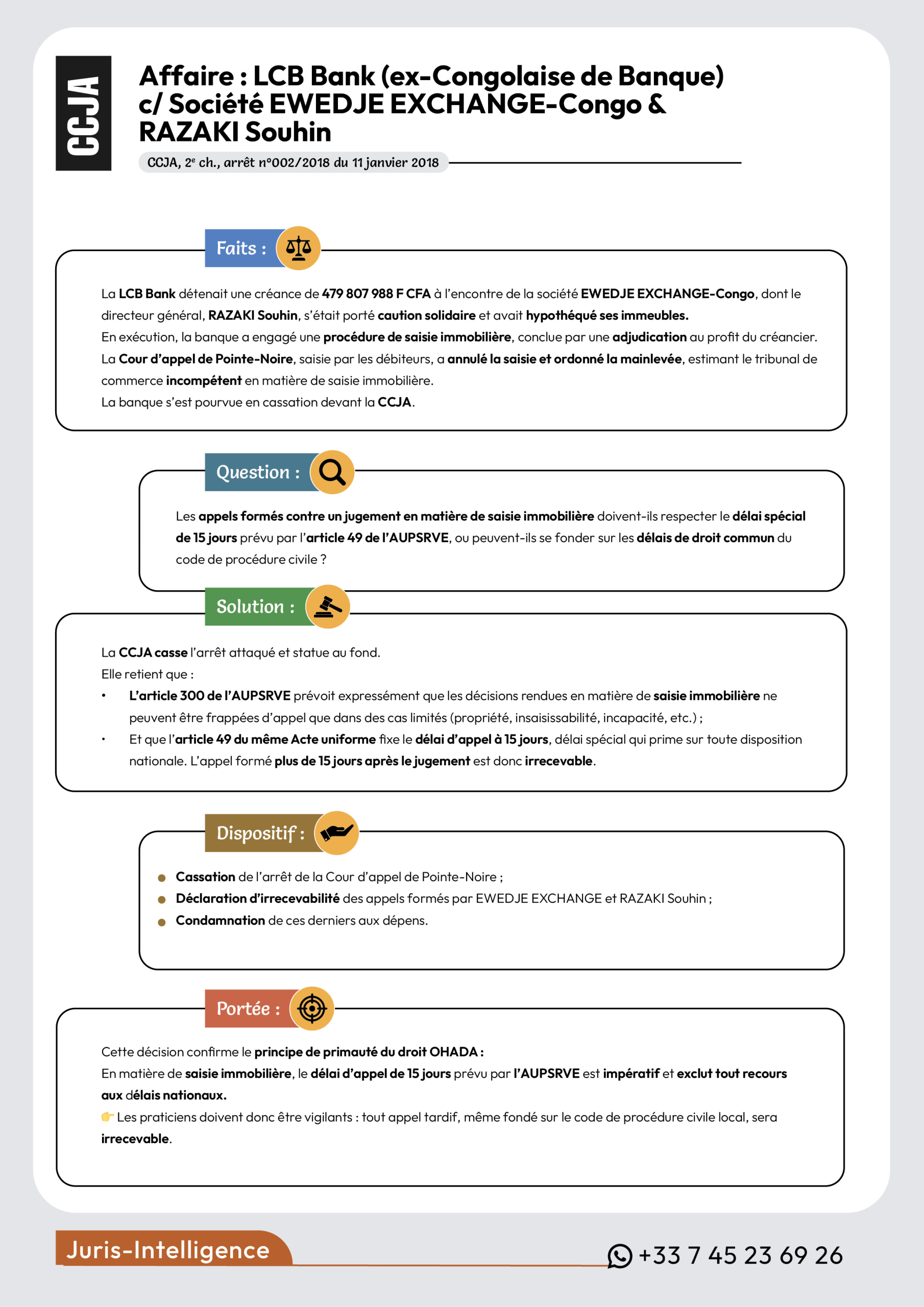La LCB Bank détenait une créance de 479 807 988 F CFA à l’encontre de la société EWEDJE EXCHANGE-Congo, dont le directeur général, RAZAKI Souhin, s’était porté caution solidaire et avait hypothéqué ses immeubles.