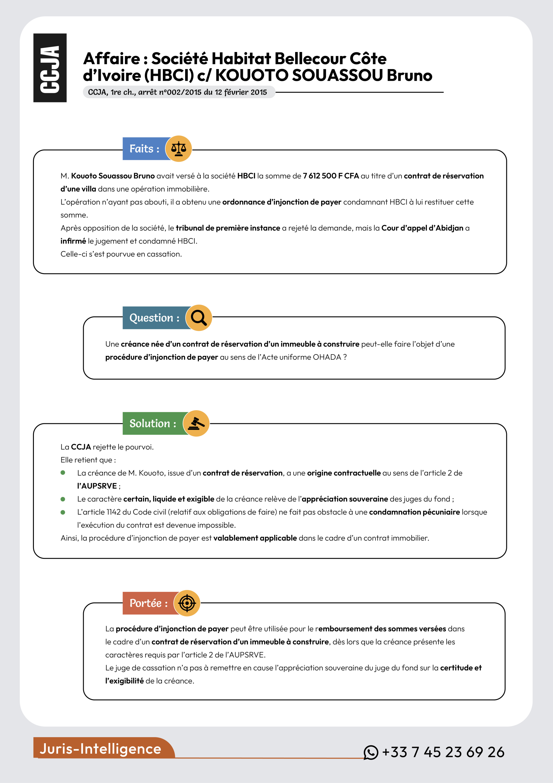 Une créance née d’un contrat de réservation d’un immeuble à construire peut-elle faire l’objet d’une procédure d’injonction de payer au sens de l’Acte uniforme OHADA ?