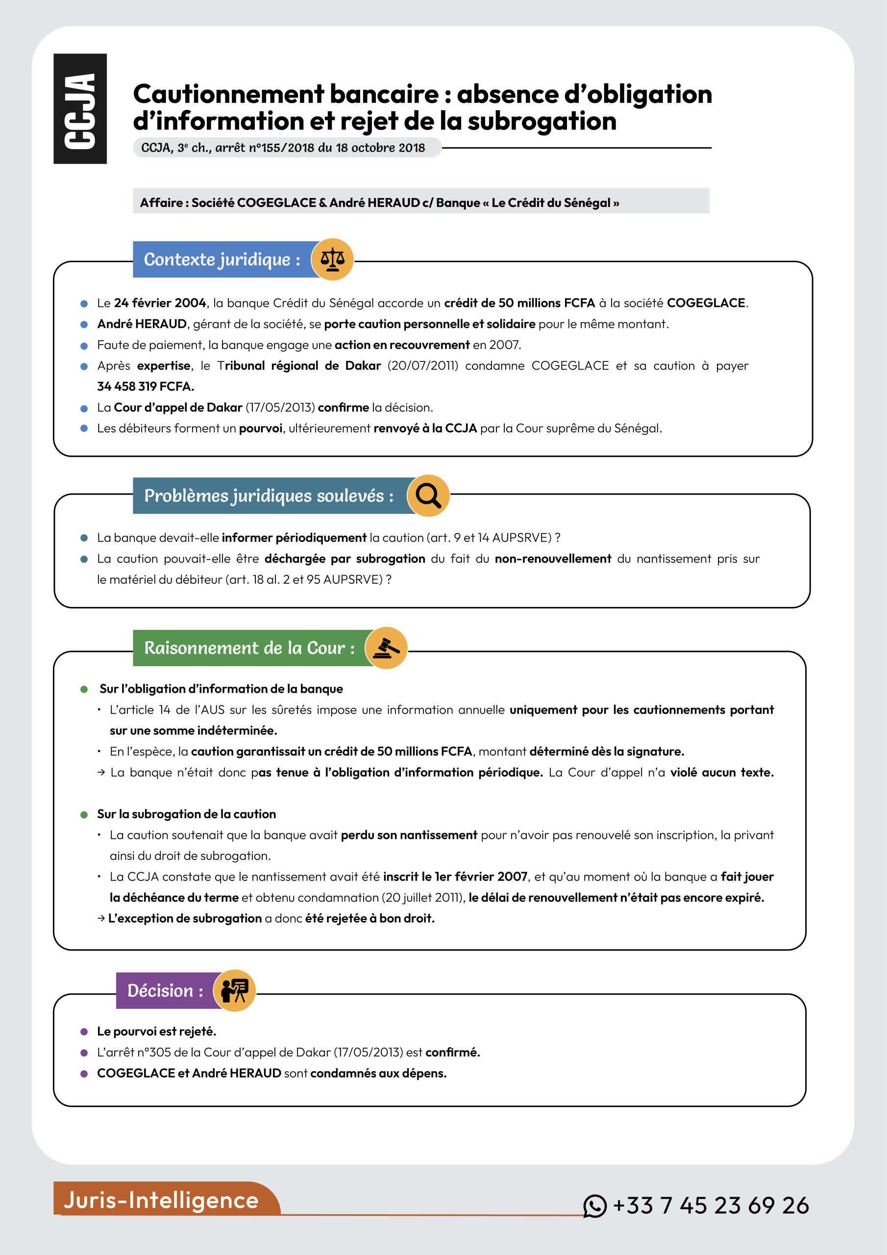• Après expertise, le Tribunal régional de Dakar (20/07/2011) condamne COGEGLACE et sa caution à payer 34 458 319 FCFA