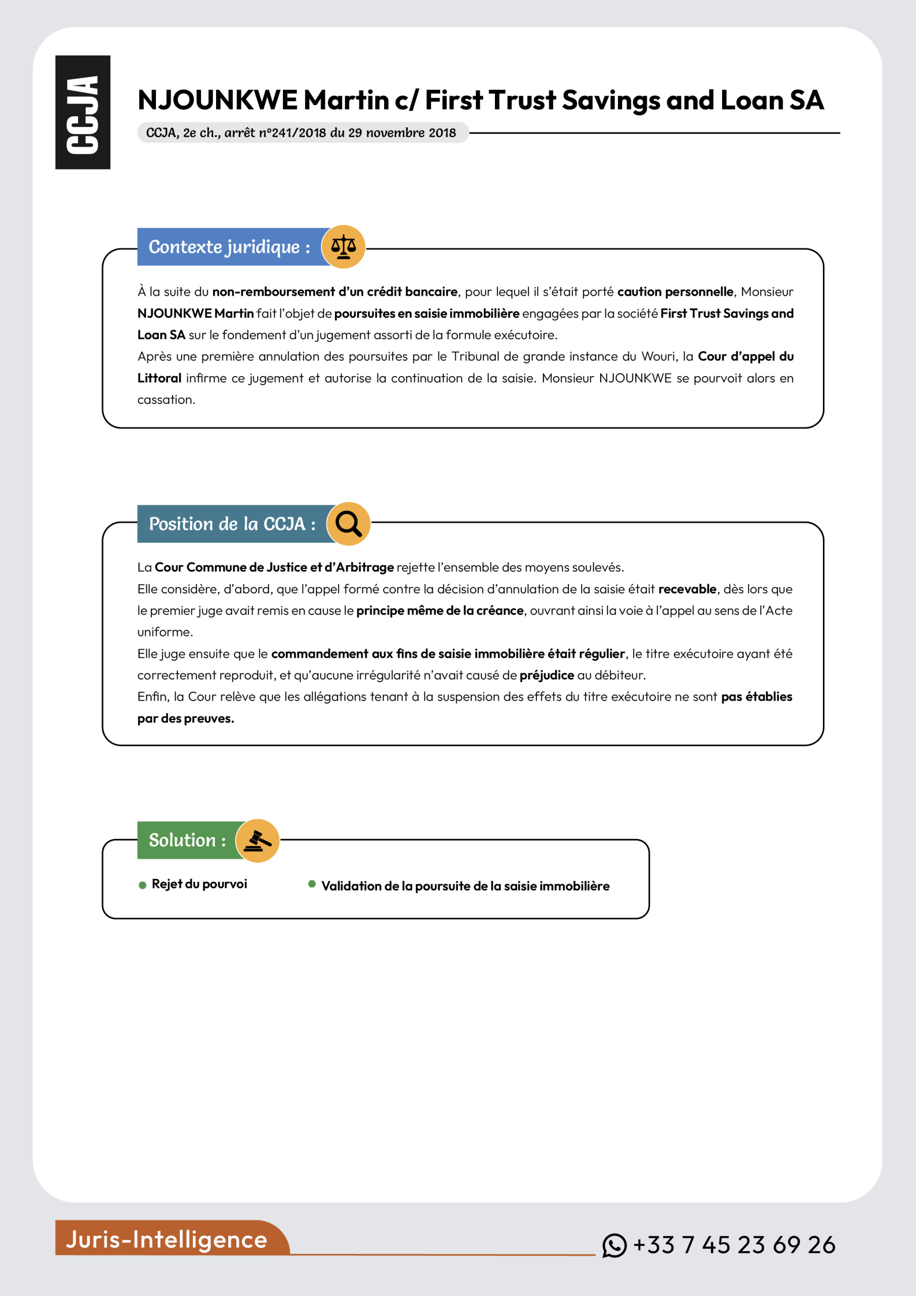 À la suite du non-remboursement d’un crédit bancaire, pour lequel il s’était porté caution personnelle, Monsieur NJOUNKWE Martin fait l’objet de poursuites en saisie immobilière engagées par la société First Trust Savings and Loan SA sur le fondement d’un jugement assorti de la formule exécutoire.