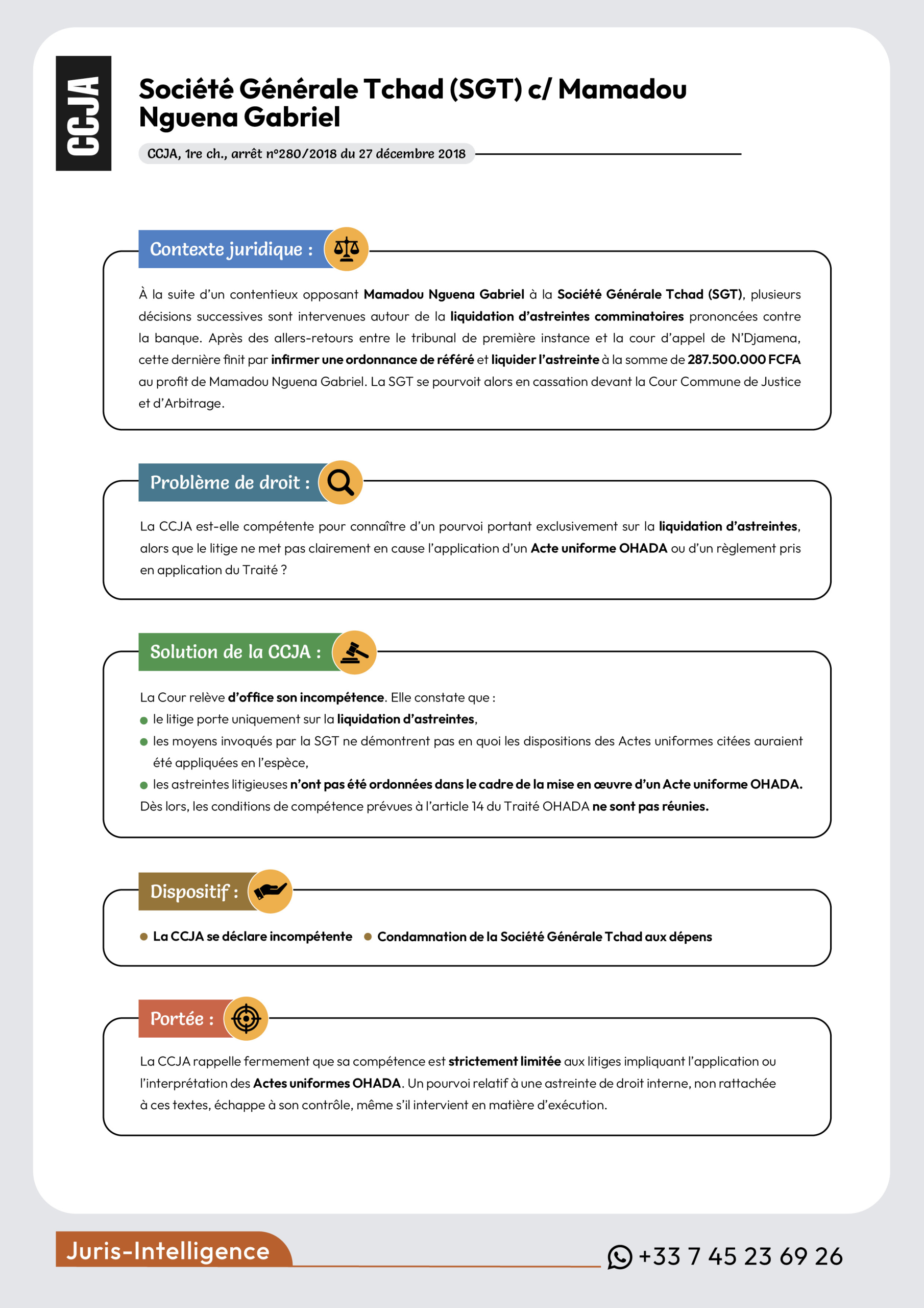 À la suite d’un contentieux opposant Mamadou Nguena Gabriel à la Société Générale Tchad (SGT), plusieurs décisions successives sont intervenues autour de la liquidation d’astreintes comminatoires prononcées contre la banque. Après des allers-retours entre le tribunal de première instance et la cour d’appel de N’Djamena, cette dernière finit par infirmer une ordonnance de référé et liquider l’astreinte à la somme de 287.500.000 FCFA au profit de Mamadou Nguena Gabriel. La SGT se pourvoit alors en cassation devant la Cour Commune de Justice et d’Arbitrage.